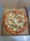 Mozzarella Cheese, Pizza Sauce, Ham, Pepperoni, Mushrooms, Onions, Green Peppers, Sausage, Bacon, Black Olives, Mild Banana Peppers.